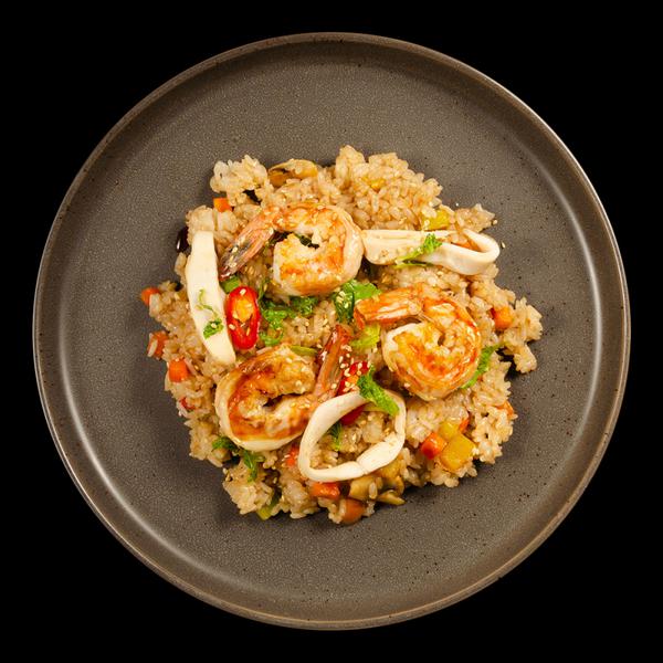 Состав: Морковь, цукини, болгарский перец, шампиньон. имбирно-чесночный соус. На ваш выбор: курица, говядина, свинина, тигровая креветка, морепродукты.