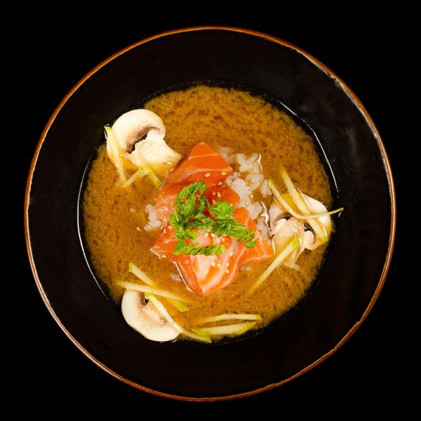 Состав: Мисо бульон, лосось, японский рис, цукини, шампиньоны, кунжут, зелёный лук.