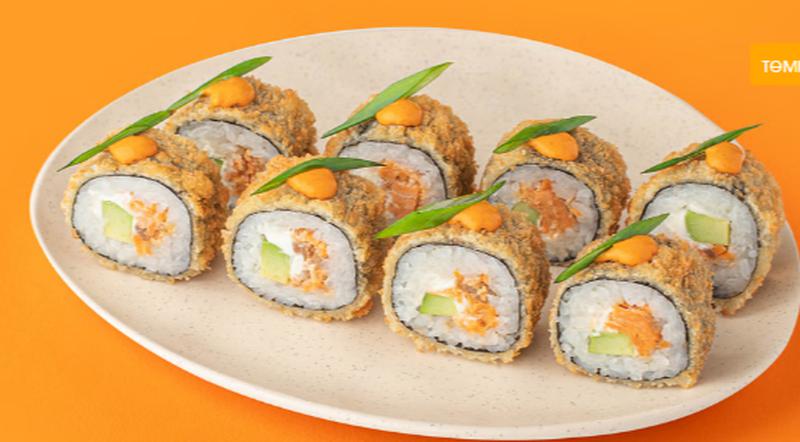 Состав: Сливочный сыр, лосось терияки (лосось, пшеничная мука, подсолнечное масло, терияки соус), авокадо, темпурный кляр (темпурная мука, вода), панировочные сухари, спайси соус, зеленый лук, рис (рис, вода, заправка для риса), нори *Не забудьте заказать имбирь, васаби и соевый соус. Они не входят в стоимость заказа.