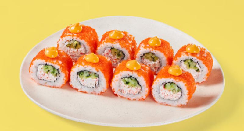 Состав: Крабовые палочки, огурец, икра масаго оранжевая, спайси соус, рис, нори. *Не забудьте заказать имбирь, васаби и соевый соус. Они не входят в стоимость заказа.