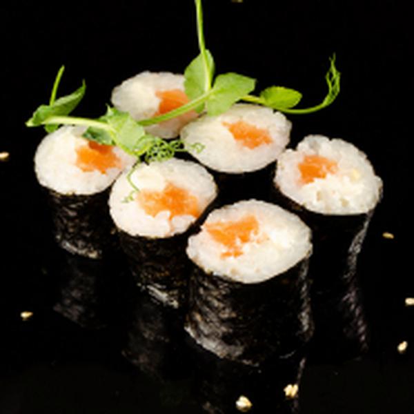 Состав: Свежий лосось, сливочный сыр, отварной рис, имбирь, васаби.