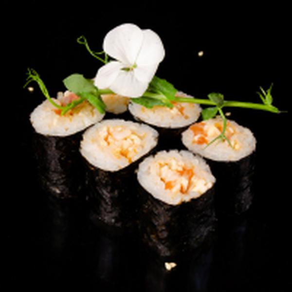 Состав: Свежий лосось, креветка, копченый угорь, снежный краб, отварной рис, острый соус спайси, имбирь, васаби.