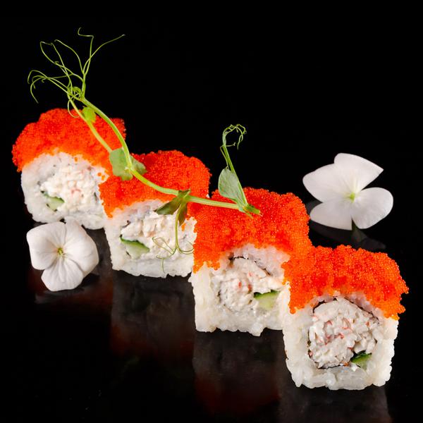 Состав: Снежный краб, соус масаго, огурец, авокадо, икра тобико, отварной рис, имбирь, васаби.