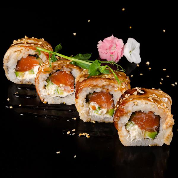 Состав: Свежий лосось, сливочный сыр, копчёный угорь, огурец, авокадо, отварной рис, имбирь, васаби.