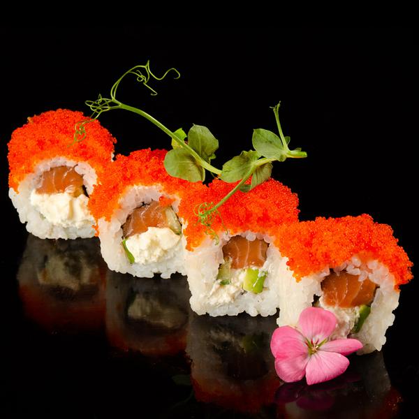 Состав: Свежий лосось, сливочный сыр, огурец, авокадо, икра тобико, отварной рис, имбирь, васаби.