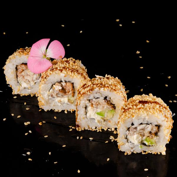 Состав: Копчёный угорь, сливочный сыр, авокадо, жареный кунжут, отварной рис, имбирь, васаби.
