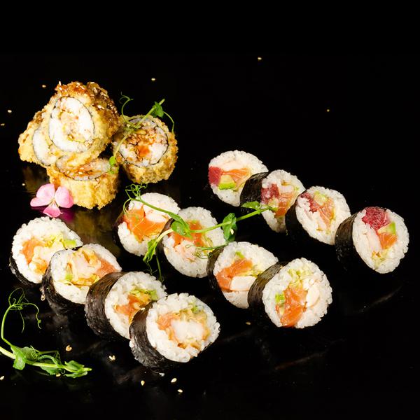 Состав: Ролл №1 лосось, креветка, авокадо, листья салата ролл №2 лосось, копчёный угорь, креветка, авокадо, кляр темпура ролл №3 лосось, креветка, тунец, авокадо. ролл №4 лосось, креветка темпура, снежный краб, авокадо.