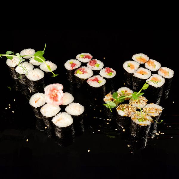 Состав: Классический ролл с лососем и огурцом-1 классический ролл с угрём и авокадо-1 классический ролл с креветкой и сыром-1 классический ролл с тунцом и авокадо-1 классический ролл со снежным крабом-1
