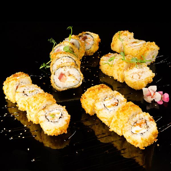 Состав: Ролл сунна сан темпура-1 ролл темпура с угрём-1 ролл темпура с лососем 1\2 ролл темпура с креветкой 1\2
