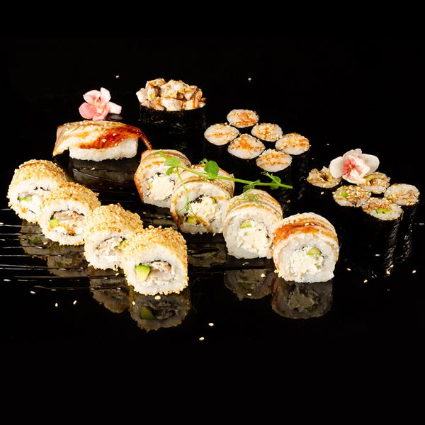 Состав: Фирменный ролл с угрём -1\2 ролл филадельфия унаги -1\2 ролл классический с угрём -1 ролл классический с угрём сыром и авокадо-1 суши с угрём -1 гункан запеченный с угрём -1.