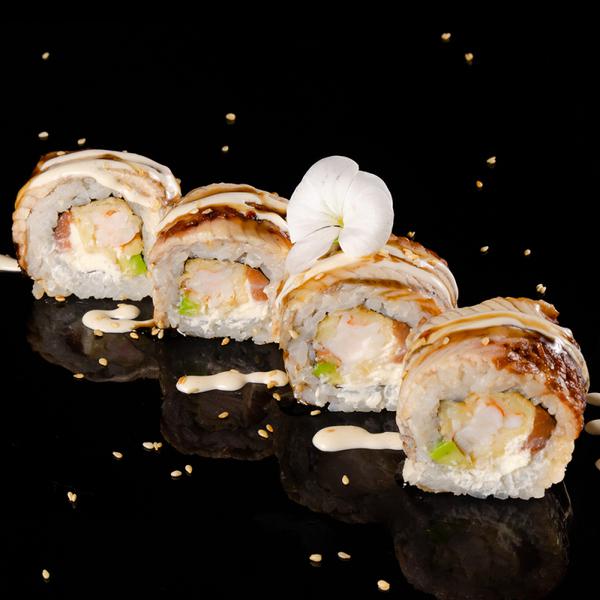 Состав: Креветка темпура, лосось, сливочный сыр, отварной рис, авокадо, копчёный угорь, имбирь, васаби.