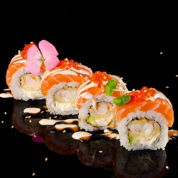 Состав: Тигровая креветка темпура, авокадо, сливочный сыр, отварной рис, охлажденный лосось, красная икра, имбирь, васаби.