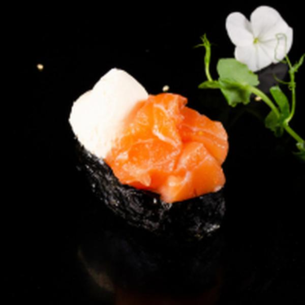 Состав: Свежий лосось, сливочный сыр, отварной рис, имбирь, васаби.